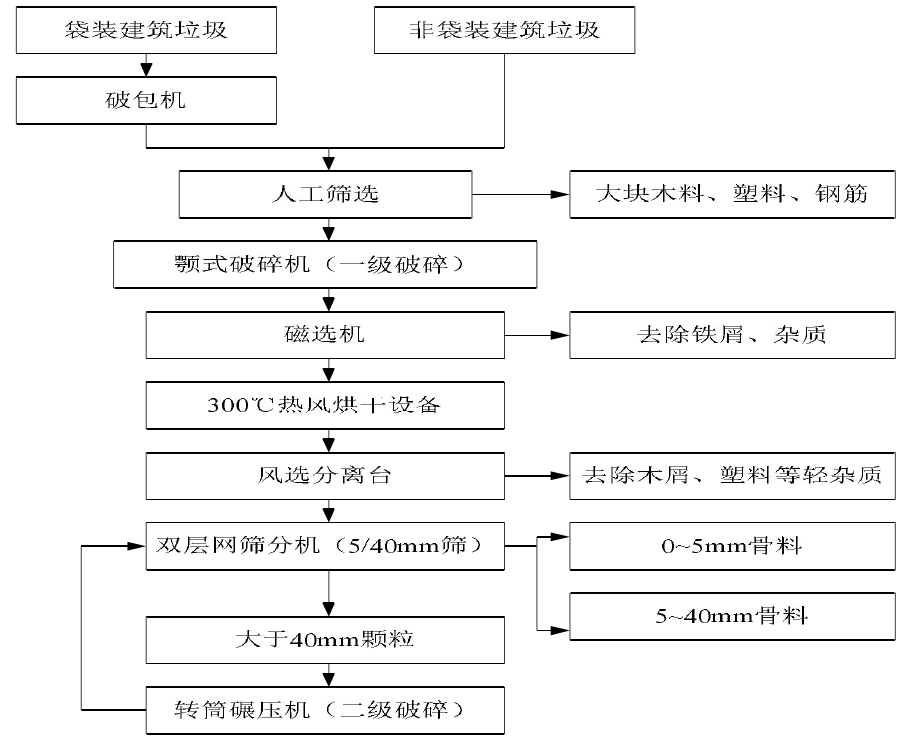 (4)建筑垃圾的預(yù)處理系統(tǒng)建筑垃圾預(yù)處理通常都是由幾種設(shè)備組成聯(lián)合處理工藝流程,達(dá)到最大程度的利用的目的。這種破碎、篩分、分選的系統(tǒng)工藝,直接關(guān)系到處理效率、處理成本和效果。國(guó)對(duì)于小批量的建筑垃圾往往通過(guò)麻袋與運(yùn)至分選中心,而今后這部分垃圾將要經(jīng)過(guò)恰當(dāng)?shù)念A(yù)處理,避免機(jī)器的損壞。松散的建筑垃圾則應(yīng)當(dāng)進(jìn)行初步分選,和后期細(xì)選以便回收大塊材料和金屬材料的回收利用。指的注意的是,對(duì)建筑垃圾進(jìn)行細(xì)分之前,應(yīng)當(dāng)對(duì)破碎大塊混凝土,使得過(guò)濾設(shè)備不能損壞,并且需要有烘干設(shè)備進(jìn)行干燥處理,防止設(shè)備內(nèi)粉塵堵塞。結(jié)合了本位提出的若干程序和當(dāng)?shù)貏趧?dòng)力較為充足的具體狀況,確定了當(dāng)前的工藝流程,如圖所示。